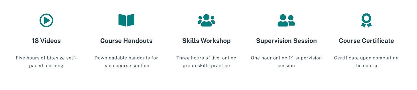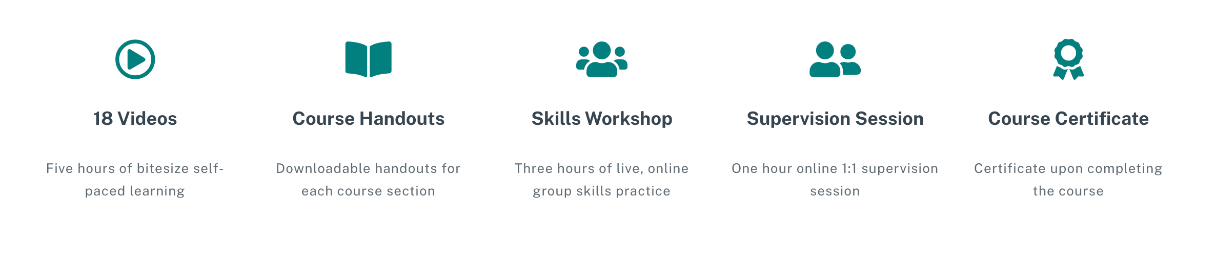 This course is a mix of self-paced online learning, followed by the live workshop and then a personalised supervision session so you can embed all the learning into your practice.